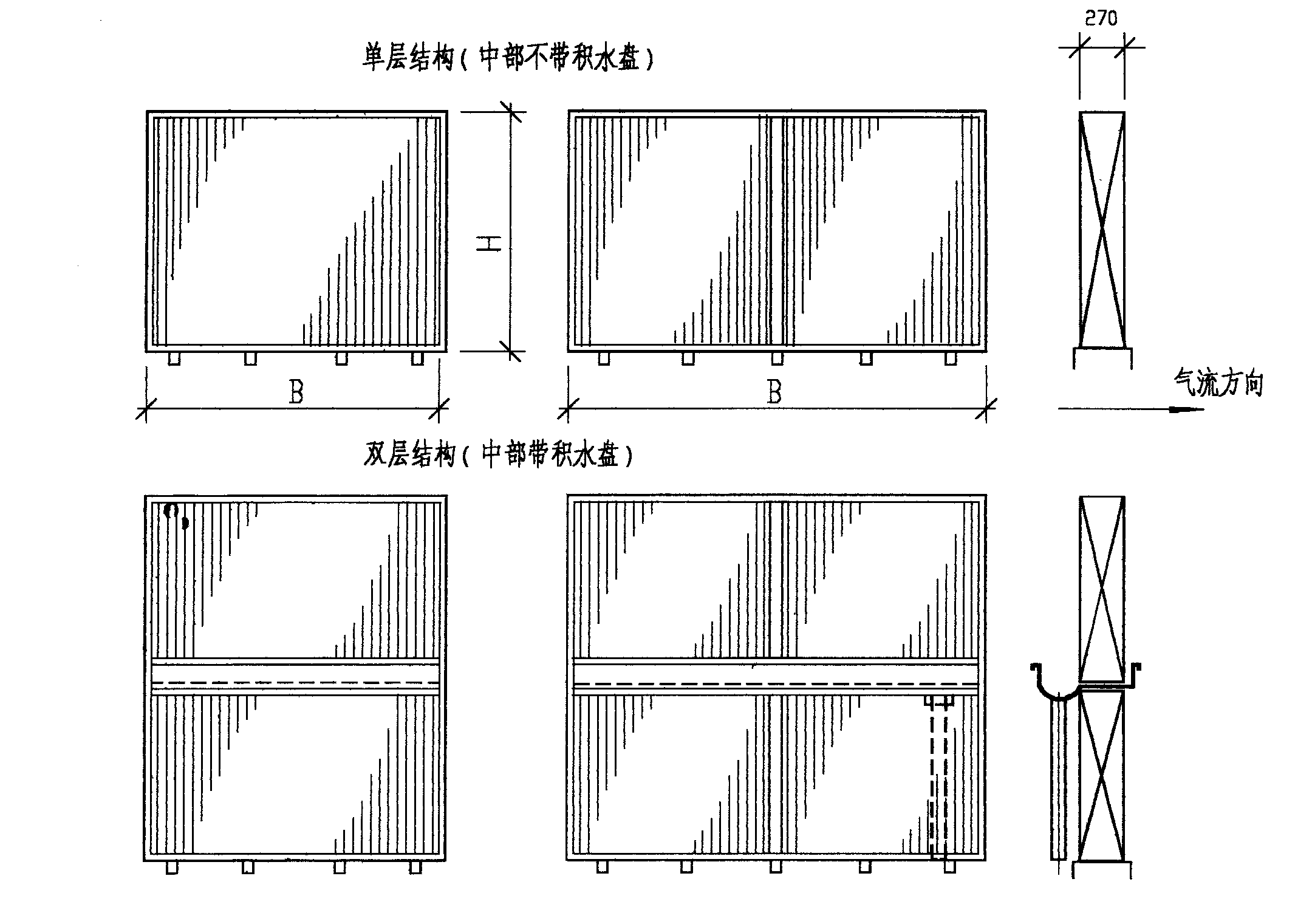 若干组串片并列置于不锈钢框架内,高度H>3000mm的分上下两层,中间加集水盘,宽度B>3000mm的框架中间加立柱。