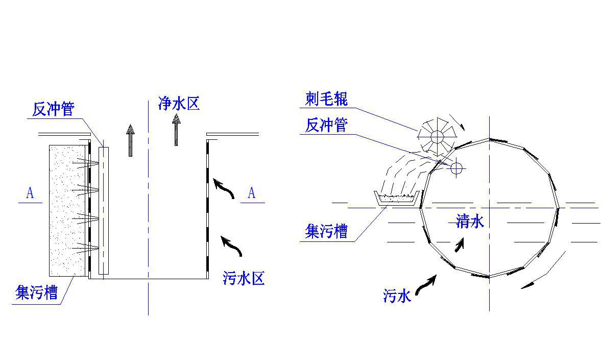3.污水从笼外进入笼内,污杂物被附在转笼外表面,冲刷水从笼内向外喷射,将笼表面的杂污物冲下进入集污槽内。在水冲刷的同时,其上方的刺毛辊与转笼同向转动,而其间的接触面则为反向运动,将粘附在转笼表面的附着物刮刷下来,随水流进入集污槽。