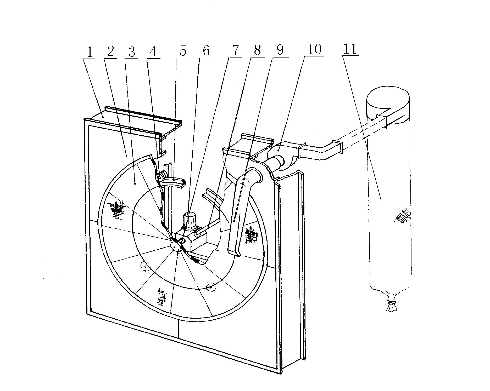 由动力机构传动园盘网面作圆周运动,同时通过特别设计的机构使吸臂作摇摆运动(吸咀作园弧往复运动),由于吸咀的摆动非常缓慢,园盘转动一周,吸咀只移动约相当于一个吸咀宽度的距离,因此吸咀在网面上的吸尘轨迹是一条较宽的渐开线。以往的园盘回风过滤网面和吸咀只有一方运动且作用面大,而现有网面和吸咀互动,使吸咀的工作更加集中有序而高效。
