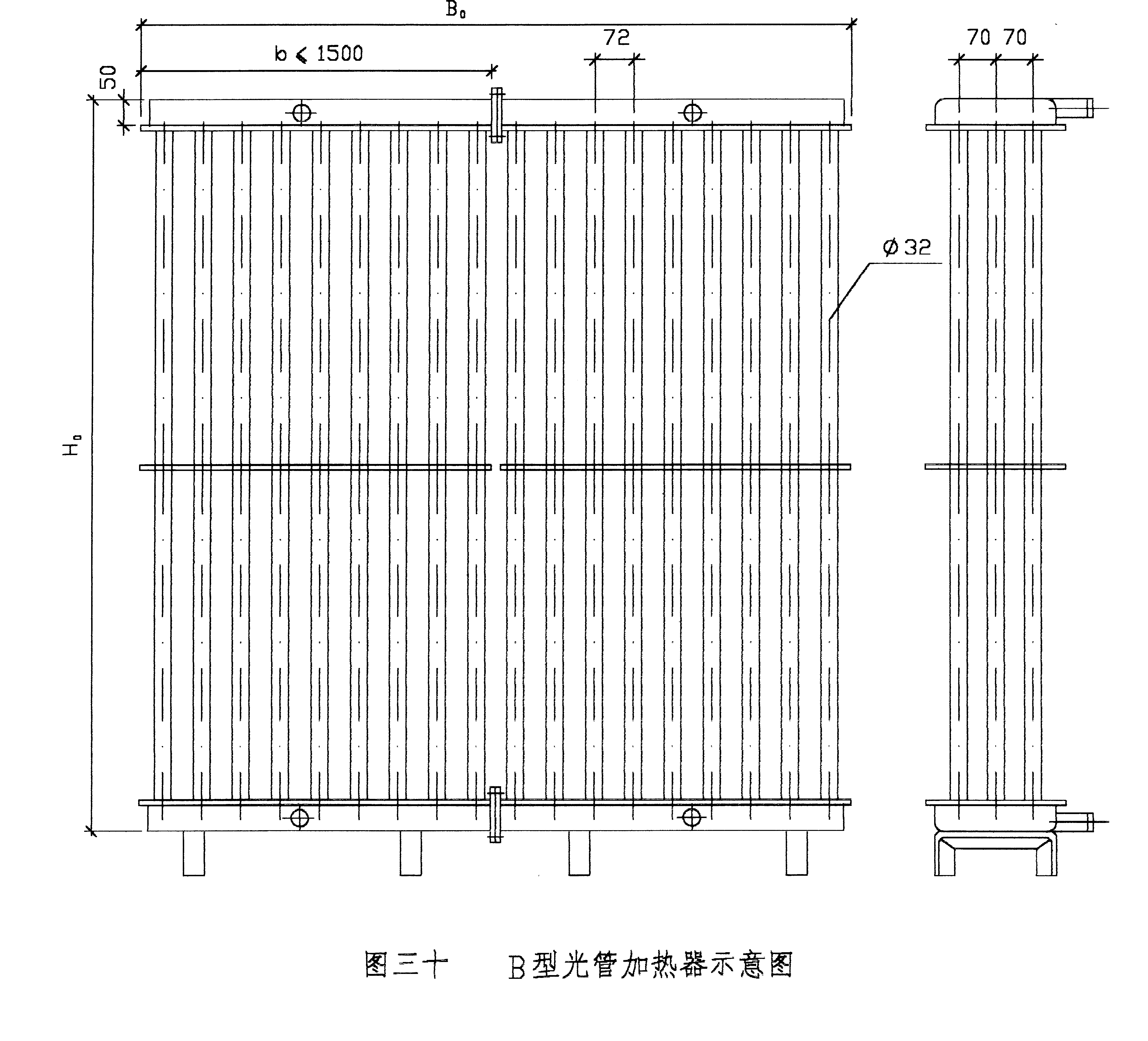 本设备是以蒸汽为热媒,用无缝钢管焊制的热交换器,也称光管加热器。因其表面光滑无棱,易做清洁维护,特别适应对含有纤尘的空气加热。散热管为立管,用Ф32无缝管制作,中心间距72mm,单位迎风面积散热面积大,加热效果好;我厂生产的加热器因上下联箱结构不同,分为A型和B型(见图二十九和图三十),A型的上下联箱管用Ф51无缝管制作,可多排组合,每排单独供汽,单独排凝结水,操作时可以单排控制,方便调节。B型加热器上下联箱为管板式,每套23排。宽度超过1600mm的加热器均为分段组装式,段与段之间用法兰联接,拆装方便。